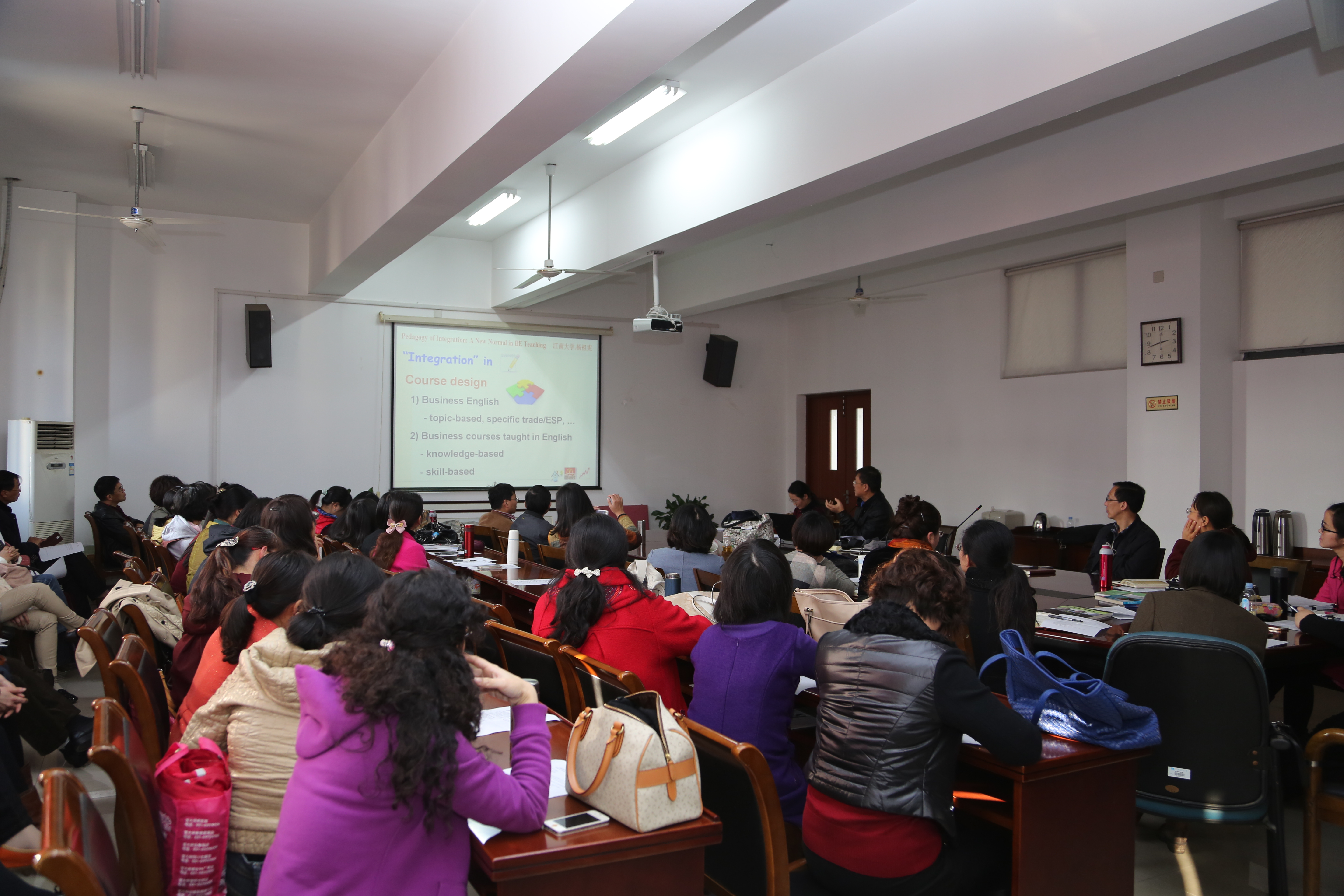 文科楼的大会议室里,来自大外部的全体教师和英语专业的部分教师汇聚一堂,聆听了一场精彩的讲座《“集成教学法”:商务英语教学中的新常态》,主讲人为英语专业的杨祖宪副教授。此次教研活动是我校大学英语2014教改方案实施以来针对新模块课程教学开出的第一次院内专家讲座。
