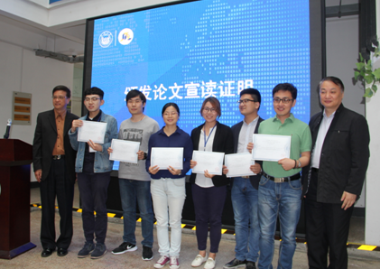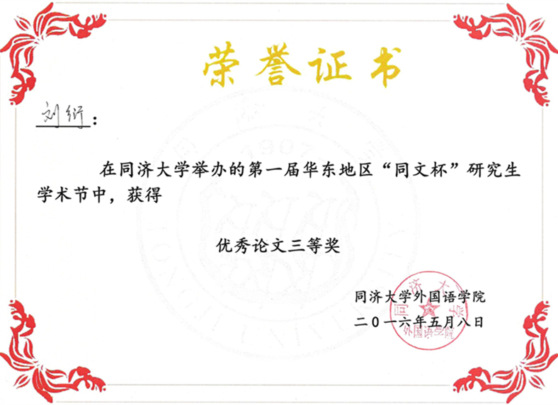 党委书记李立贵副教授颁发的论文宣读证明;之后,选手们依次进行公开展示,接受来自同济大学吴建广教授、上海外国语大学陈坚林教授和华东师范大学张春柏教授、胡范铸教授等评审专家和观众的提问。最终,同济大学博士生王峰摘得一等奖;华东师范大学博士生汤燕和复旦大学韩籍博士生吴有晶获得二等奖;一品探花