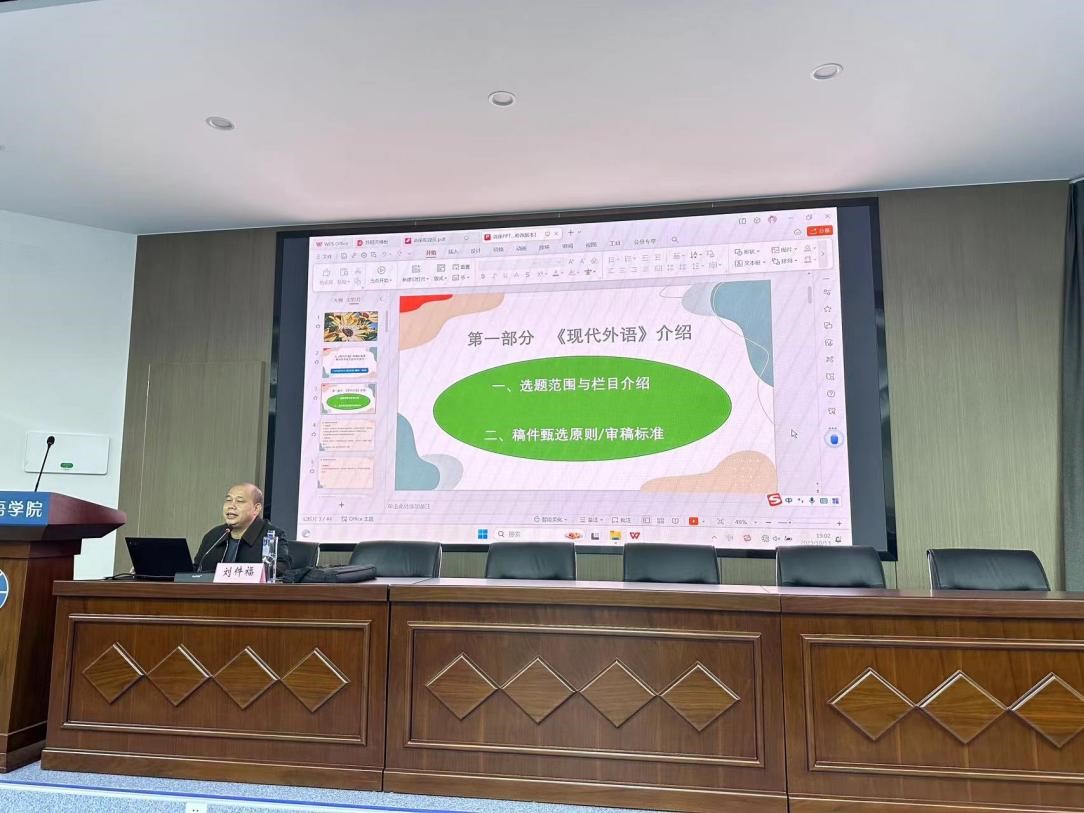 刘件福研究员首先从选题范围、栏目介绍、审稿标准等方面对《现代外语》杂志进行了介绍。特别对原创性研究论文、综述性论文、书刊评介三种不同类型稿件及其写作要求进行了重点说明。