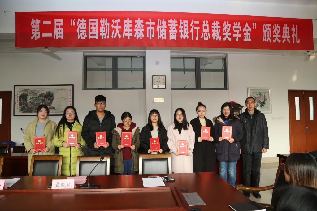 德国勒沃库森市储蓄银行总裁奖学金由德国勒沃库森市储蓄银行总裁曼弗雷德·赫博斯海姆先生捐赠,旨在鼓励和资助品学兼优的本科生及研究生。奖学金经过个人申请、学院审核,最终确定获奖的优秀学生。通过对学生的奖学金奖励,有助于鼓励学生继续努力学习、奋发向上并在个人能力、社会实践等多个方面全面发展。
