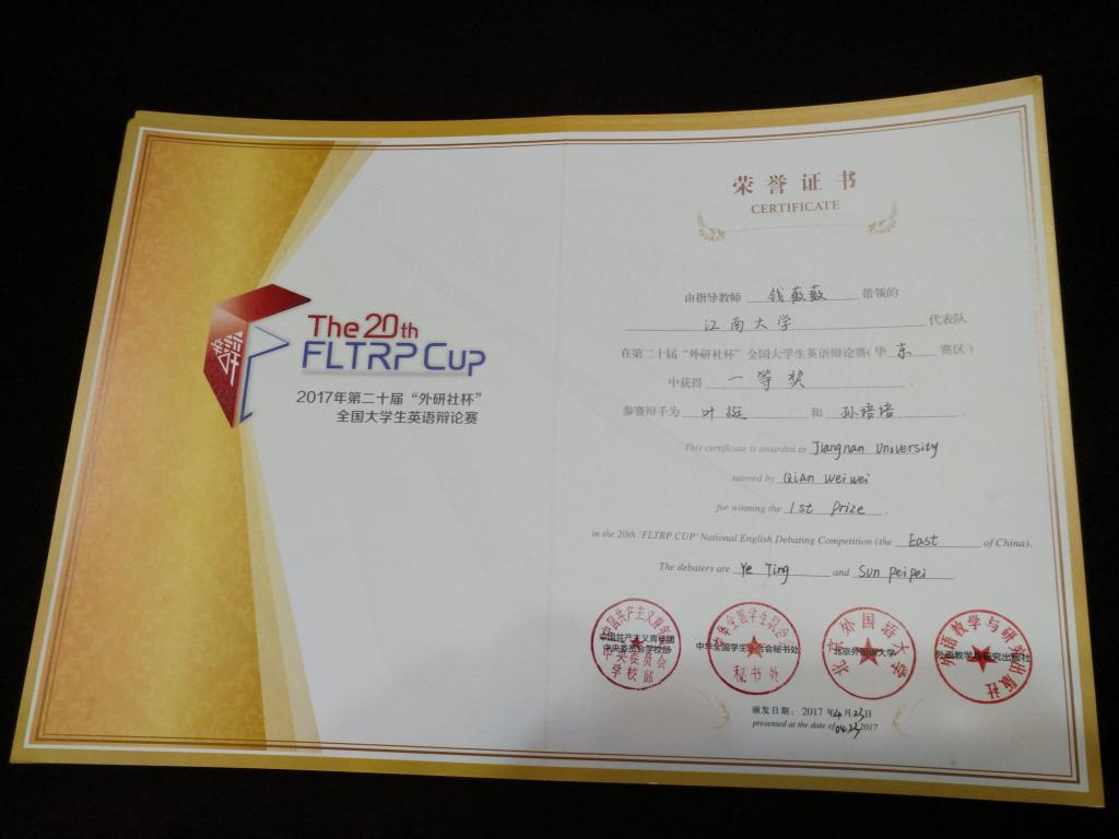 钱薇薇老师担任指导教师,英语专业孙培培和叶挺同学作为参赛选手组成。比赛现场,我校选手表现出扎实的语言能力和缜密的思辨思维,在五轮循环赛后居华东决赛区第六,最终获得一等奖。这是我校参加全国性英语辩论赛以来取得的最佳战绩。