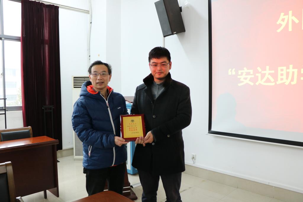 随后,由捐赠人安达公司代表陈志刚先生发言。他用亲身经历鼓励同学们要静下心来学习,向身边的人学习,多多积累经验,为日后生活做长远打算。之后由学院党委书记黄城芳为安达公司颁发捐赠证书,并再一次对安达公司在一品探花