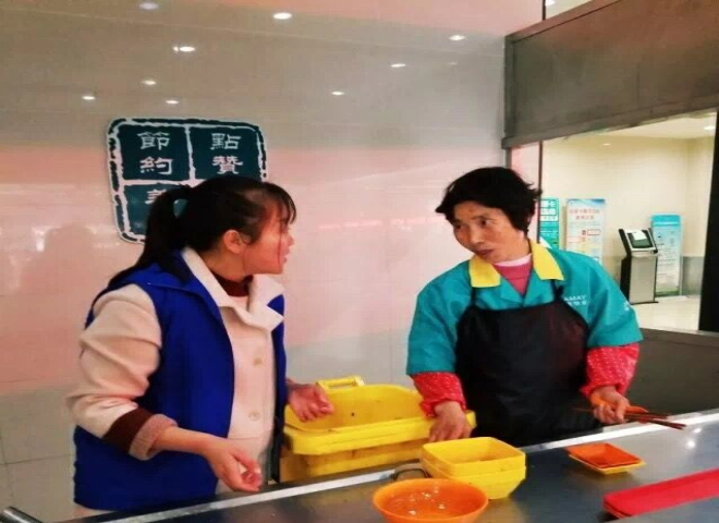 志愿者和食堂后勤阿姨交流工作心得