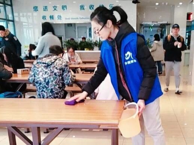 志愿者帮助三食堂阿姨擦桌子整理垃圾