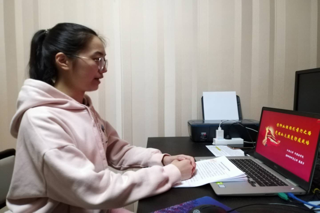 19硕研党支部书记戴圆方为大家分享。戴圆方主要围绕“共产主义信仰是共产党人的命脉和灵魂”、“坚定信仰,让党旗在战“疫”一线高高飘扬”、“抗疫过程中彰显的中国特色社会主义制度优势”、“坚定信仰跟党走”几个方面进行分享。过程中除了分享自己面对这场全民战“疫”中的所思所想,还通过播放主题视频引导大家感受中国速度、中国力量以及中国精神。在临近结束时,她说:作为新时代的青年学子,深切感受了国家建设所取得的巨大成就,真切感受到了中国道路所蕴藏的巨大能量。我们不仅要坚定信心,打赢疫情防控阻击战,也要勤学苦练,在实践中练就过硬本领,用实际行动诠释新时代青年的责任与担当。