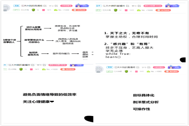 十佳青年、2019外研社杯全国英语写作大赛总决赛二等奖等荣誉,现已保研至中国传媒大学国际新闻学。分享会主要围绕“目标的具体化”、“立足专业学习,拓宽自己的兴趣面”、“聊聊情绪管理与高效学习这件事”三个方面进行。
