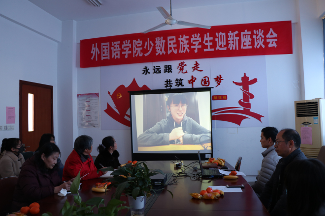 会议一开始,获得学校十佳大学生称号的冯小宸同学,通过在线视频的方式为现场的学生分享了自己的学习感悟和奋斗故事,她以自己学习“逆袭”的经历鼓励大家努力学习,勇敢挑战。接着,现场的同学纷纷分享了自己在校的学习生活情况、遇到的困难以及自己民族的春节习俗。来自苗族的19级许维念同学说:来到一品探花