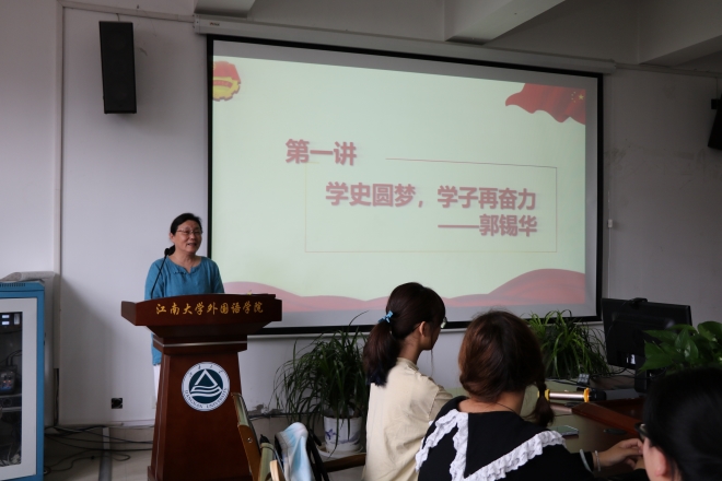 最后,学院关工委委员郭锡华老师为学员带来了第一讲——《学史圆梦,学子再奋力》。首先,郭老师结合自身经历,讲述了学习中国共产党简史的心得。她强调了学习百年党史的重要性,指出“初心”关键词,告诫我们要时刻牢记初心,坚守初心。郭老师分享了新时代对外语人的新要求,希望外院学子深入专业方面的研究,争做国际复合型人才,让初心薪火相传,把使命勇担在肩。