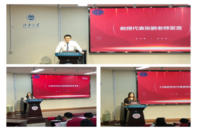 在新生代表发言环节,圣雨涵同学代表本科新生站在新的起跑线上热情发言,表达了对未来学习生活的憧憬,分享了自己的大学规划。22级研究生代表梁悦思则分享来到江大外院的喜悦,代表研究生表达了对学术研究的不懈追求。两位同学都强调了践行“笃学尚行,止于至善”校训的重要性。