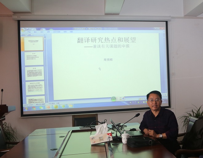 大会议室济济一堂,迎来扬州大学博士生导师周领顺教授题为“翻译研究热点和展望——兼谈有关课题的申报”的学术讲座。讲座由朱义华副院长主持。
