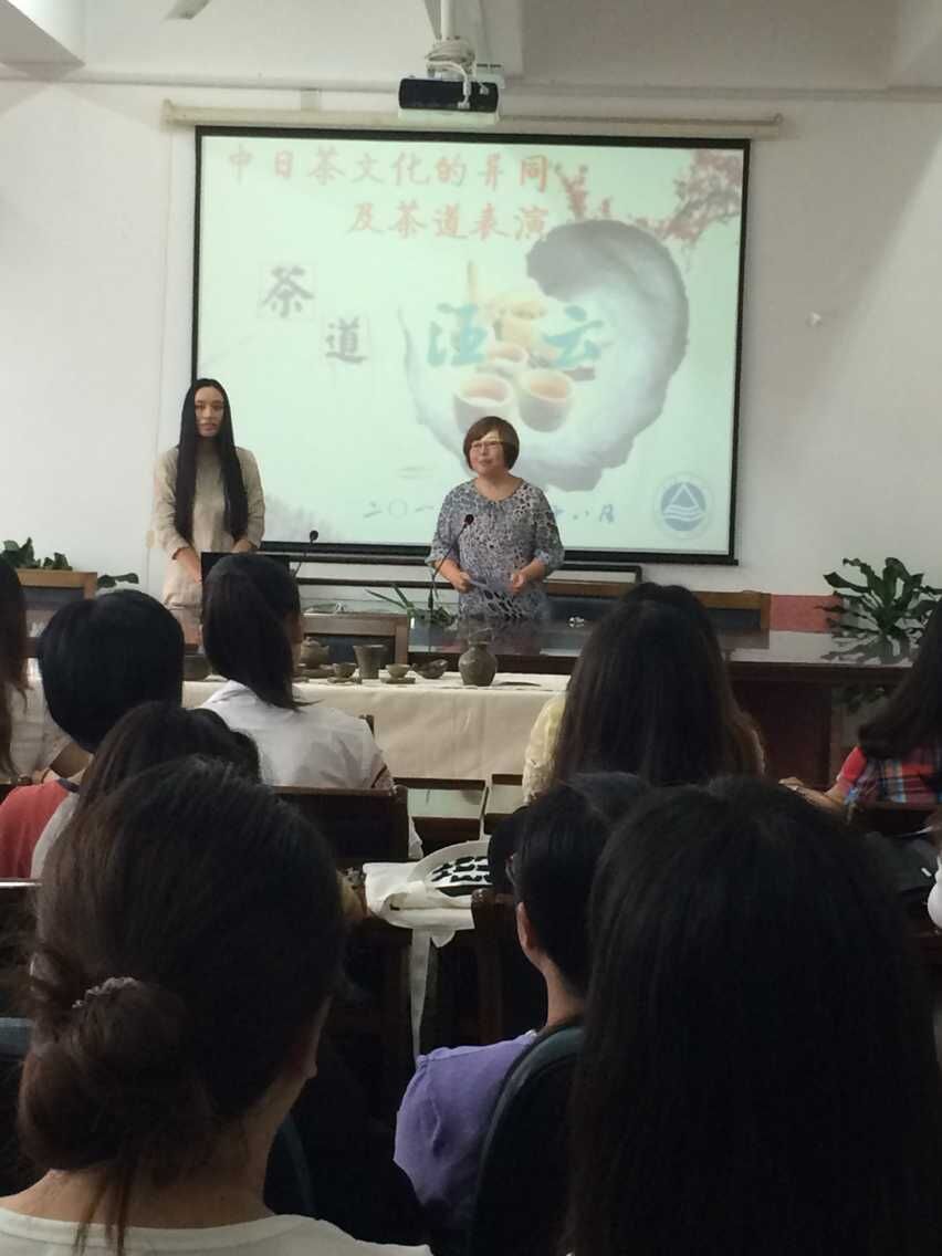 在茶道表演结束后,汪老师回答了同学们关于中日茶道的疑问。不仅如此,还让学生亲身体验茶艺的精髓。一场看似简单地讲座,却让学生亲身体会到了日本茶道文化的“和静敬寂”,弥补了我们在课堂教学上的不足,使学生受益匪浅。