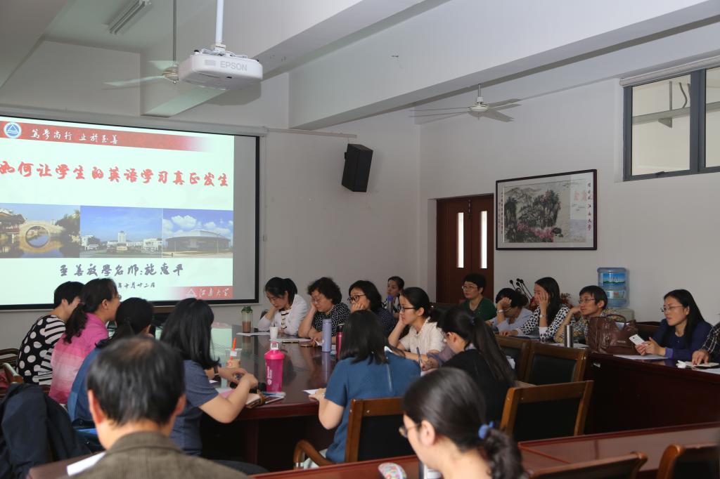 参与此次活动的教师也与施老师展开了积极的互动。对于教师们提出的问题,施老师均一一耐心解答。施老师在交流中也强调:作为一名教师,课堂上你可以给学生示范,但更重要的是赋予学生更多的责任,让学生学会自主学习。教师在逐渐释放责任的过程中,教学内容的设计一定要对学生具有挑战性,同时符合学生的兴趣,让学生有更多的机会真正参与课堂教学。教师也要通过表扬、鼓励、督促、检查等多管齐下的方法激发班里每一位学生的学习兴趣和动机,让学生真正感受到英语语言的魅力和英语学习带来的乐趣,从而在短期内取得明显的英语学习进步。