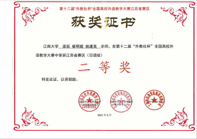 日语教学团队荣获二等奖,这是日语教学团队首次在省级教学比赛中获得佳绩,为日语教学团队参与教学比赛取得突破进展。