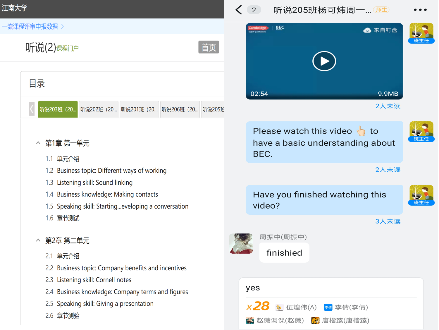 企业微信一个个寻找未入群的学生。通过三方的共同努力,除了少量学生因特殊原因外,均已进入班级群。9月6日上午,大学英语线上教学正式开始,教学工作进展顺利,教学效果良好!