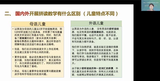 教授、外语教师教育与发展研究所所长张海燕教授的话题为《小学英语教学中语音意识的培养》。她首先介绍了语音意识的定义及其构成要素,强调了它在自然拼读和语言学习中的重要性。通过具体实例的拼读教学演示辨析了一系列语音学术语。同时,她分享了美国课堂中提高学生语音意识的方法,为我国教师开展自然拼读教学提供了启示。
