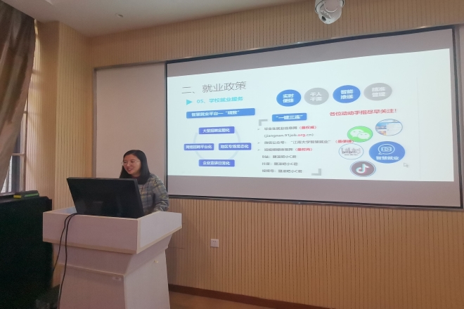 会议伊始,陆芳老师结合多个实际案例和具体就业数据,对常态化疫情防控背景下的就业形势做出分析。陆老师强调,当前就业形势严峻复杂,同学们面对新形势、新挑战,应当尽早规划、尽早准备、尽早行动。