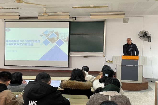 2018级学生实习工作,引导学生做好实习前的各项准备,同时推进2022届就业工作的顺利开展,12月28日上午在二教2D108召开2018级实习动员大会暨就业工作推进会,学院党委副书记刘伯贤、副院长顾琦一、英语系副主任杨昊、日语系副主任管纪龙、本科教务王琰玲以及年级辅导员苗文建参加会议。