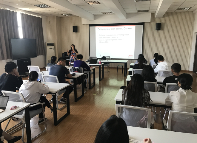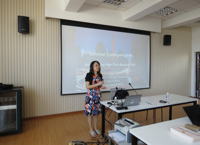 A529准时召开。本次活动由美国北卡罗莱纳州立大学(NCSU)英语系技术传播专业教授丁慧玲主讲。参加本次沙龙活动的有专业课老师及学院各年级本科生和研究生。本次讲座的主题是:技术传播:一个蓬勃发展的写作设计行业。