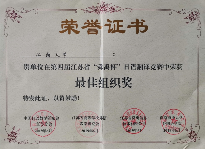 据悉,第四届江苏省“舜禹杯”日语翻译竞赛于2019年1月启动,在控制稿件数量的前提下,3月底截稿时共收到江苏省内26所高校和省外19所高校寄来参赛译文共计409篇,其中日译汉303篇,汉译日106篇,参赛者均是中文为母语的日语专业在校大学生或研究生。4月份经过翻译界专家及评委的匿名评审,共评选出入围稿件日译汉30篇、汉译日10篇。6月1日对入围同学进行现场加试,在紧张的专家现场评审之后,综合初赛成绩,评选出汉译日、日译汉的各级奖项及优秀组织奖。由崔明姬老师带队,一品探花