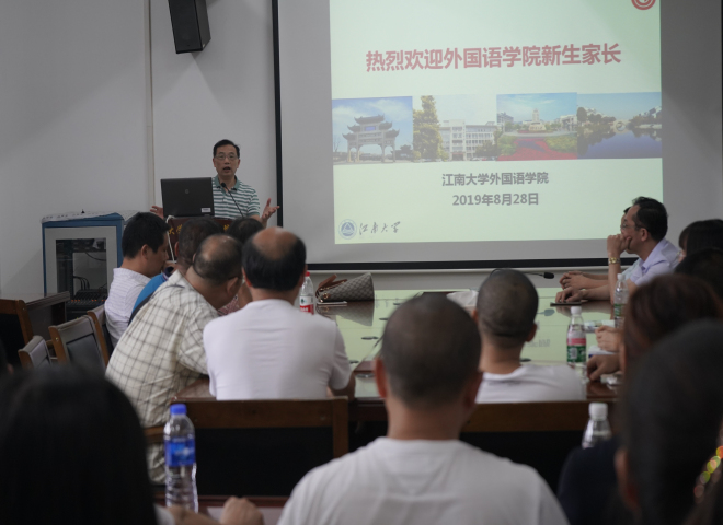 的发展历程和基本情况,然后围绕学生的思想与生活对家长提出了三点希望和要求:一是加强对孩子的思想教育,家校要形成合力共同教育,不仅关注孩子的成绩更要关心孩子的身心健康;二是始终关心孩子的学习和生活,大学不是“保险箱”,作为家长要了解孩子的学习状况,积极鼓励孩子升学考研;三是教育孩子遵守校规校纪,红线、底线不能碰,学生要严格遵守学校的规章制度。接着,方文开院长以“来江南遇见更好的自己”引出了话题。方院长主要从学院建设发展、师资力量情况、学科建设与成效等方面为家长进行详细介绍,在与家长互动环节,方院长更是从专业学习的角度为学生家长进行解答。最后方院长鼓励学生要为自己设立学习目标,并不断努力,一步一步实现自己的目标。