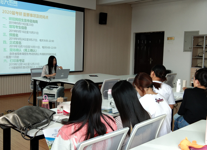 于9月25下午两点,在文科楼A529举办了针对2020届考研学子的“考研精讲会”,邀请海天考研无锡分校首席院校规划师黄春梅老师就如何备考、择校、调剂、跨考等方面跟同学们面对面交流。一品探花