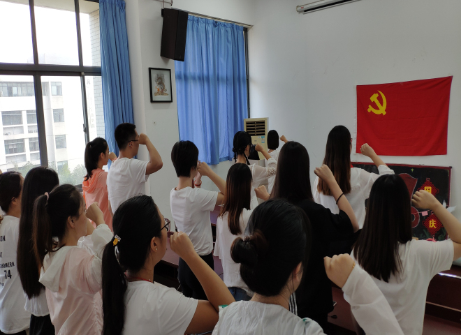 活动伊始,两个党支部共同制作了以“庆贺中华人民共和国成立70周年”为主题的宣传展板。学生党员们通过展板绘制、卡片书写等形式纷纷表达了对祖国的衷心祝福。随后,现场全体党员面向党旗,重温入党誓词,更加坚定了学生党员为共产主义事业奋斗终身的决心。