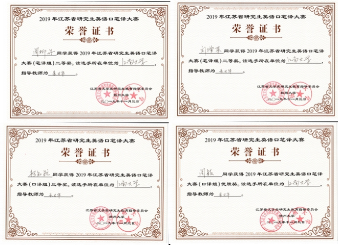 18级研究生周柳丹、刘增荣双双获得笔译组二等奖,18级研究生杨知然获得口译组三等奖,19级研究生周敏获得口译组优胜奖。