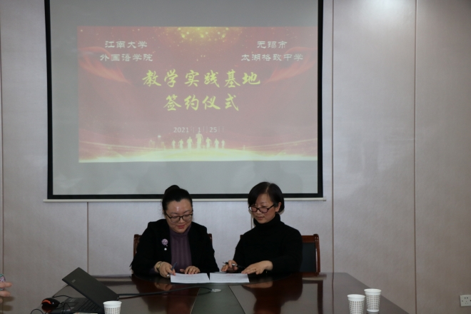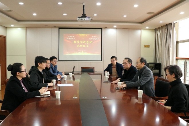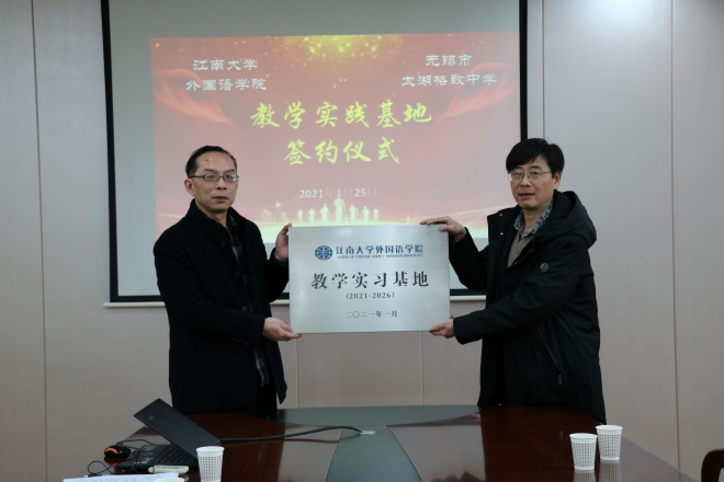 与无锡市太湖格致中学共建教学实习基地暨授牌仪式在无锡市太湖格致中学三楼会议室举行。学院院长方文开、党委副书记刘伯贤、副院长顾琦一、副院长谢竞贤及学院社会服务部程方老师、无锡市太湖格致中学校长惠晓虹、副校长蒋茂元、副校长余志明、副校长王万萌参加了签约仪式。
