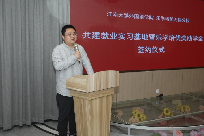 与乐学培优无锡分校共建就业实习基地暨奖助学金签约仪式,学院党委副书记刘伯贤代表学院向乐学培优授予“就业实习基地”铜牌。