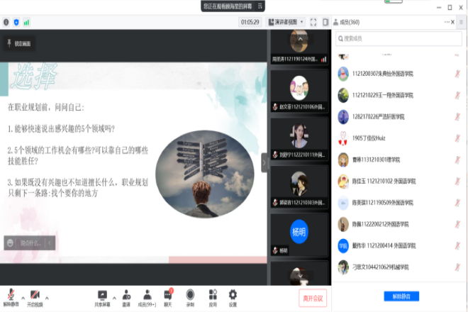 本次圆桌交流会中,顾海星老师重点讲述心理状态的调节,以“我”为中心去感受、去观察、去反馈,助“我”成长,同时为大家提供了学业、职业发展方面的指导。线上参会同学们收获颇多,对如何悦纳自己、寻找自身价值有了更深的认识和理解,也将在接下来的学习生活中走得更好、更远。