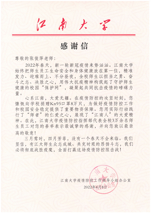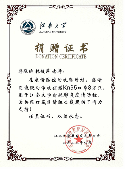 校教育发展基金会为张俊萍老师颁发了捐赠证书,校疫情防控工作领导小组办公室专门给张老师发来了感谢信。张老师捐赠的这批口罩为学校打赢疫情防控阻击战提供了有力支持,为疫情防控和校园安全提供了重要物资保障,对学校落实疫情防控四方责任作出了贡献。