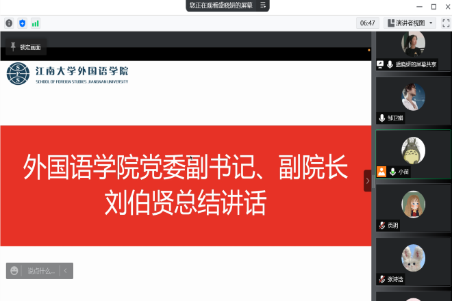 最后,学院党委副书记刘伯贤总结讲话。刘书记说:不同地区、不同民族的学生来到江大外院,大家的目标都是希望通过努力让自己变得优秀,成为更好的自己。过程中大家要坚定理想信念,紧密团结,共同奋进,将小我融入大我,在青春的赛道上跑出最好的成绩。