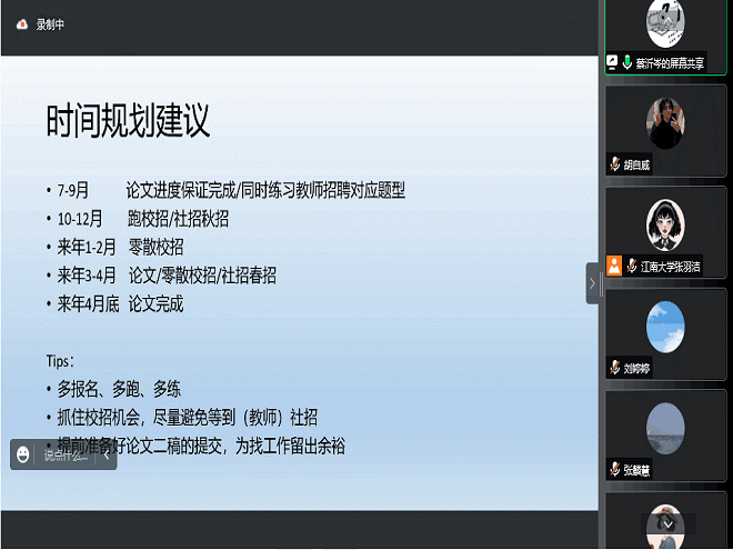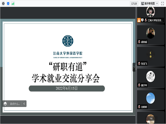 “研途奋进”第九期活动在腾讯会议平台成功举办,本次活动主题为“研职有道”学术就业交流分享会。2021级全体硕士研究生及部分2019、2020级硕士研究生线上参与了本次活动。2022级拟录取同学也参与了本次分享会。四位2019级硕士研究生结合自己升学求职经历进行了分享。