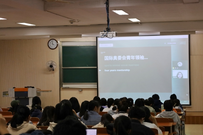 首先,林诗凌介绍了自己当下所从事的工作,分别是“传统体育融合现代体育”、“传统体育产业青年互动”和“传统体育数字呈现”。她发起和制片的动画短片《水与舟》在瑞士洛桑举行的国际奥委会青年峰会上展示并获得好评,借此,她鼓励同学们敢于打破常规,善于运用不同的思维方式提高创新能力。