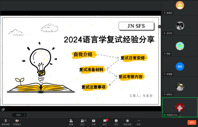 此次考研复试经验分享会内容干货满满,四位学姐不仅传授备考方法和经验,还为处于迷茫期及自信心不足的考研学生加油打气,交流环节大家进行了积极的互动问答。相信准备复试的同学听过分享后收获满满,祝愿同学们研途顺利。