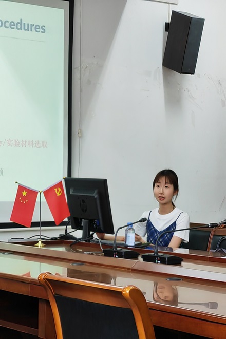 随后,研二的邓暄惠同学分享了自己开题报告的撰写经验。她从研究背景、文献综述、研究问题的确定和研究方法及实验流程四个方面向同学们解读了开题报告写作的要求,并给研一同学开题前期准备和答辩过程提供了切实可行的建议。