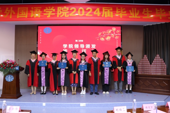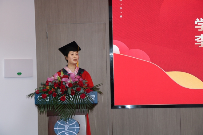 党委书记李荣华发表毕业寄语。首先,李荣华对毕业生们表达了真挚的祝福,对老师和家长们表示了衷心的感谢。随后,他回顾总结了外院2024届学子一路走来的成长与收获,赞扬了大家砥砺奋斗取得各项成绩。最后,李荣华分享三点:致知,做深学笃行的学习者;致行,做知行合一的践行者;致远,做创新有为的奋进者。寄语大家:肩负时代使命,提升专业本领,涵养家国情怀,形成全球视野,努力成为又红又专又雅的外语人,奋力书写为中国式现代化挺膺担当的青春篇章!