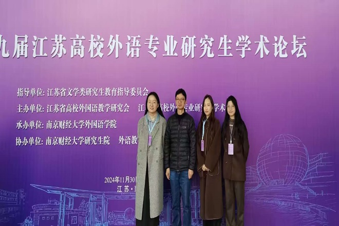 带队导师袁雪生和3名研究生代表参加了此次论坛。本届论坛由江苏省文学类研究生教育指导委员会指导,江苏省高校外国语教学研究会主办,南京财经大学承办,并得到外语教学与研究出版社及上海外语教育出版社的协办支持。本次论坛特邀东南大学李霄翔教授、苏州大学朱新福教授、南京大学陈新仁教授等知名学者,围绕外语教学、翻译研究及文学文化领域的前沿课题展开深度探讨。