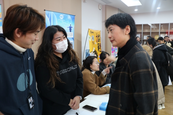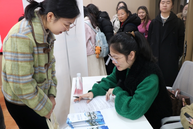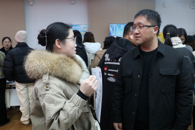 本次招聘会吸引江苏国泰华盛、新东方教育、弘元绿能、无锡金丽洁等十余家用人单位参会,涵盖教育培训、贸易、快销等诸多行业。下午14点,在君金报告厅举行企业宣讲会,参会企业依次上台,对企业情况、岗位招聘、福利待遇等进行介绍。宣讲会结束后,在学院锦洲报告厅举行招聘会,学院2025届毕业生、2026届实习生及低年级同学也来到会场学习交流。求职学生手持个人简历,与意向企业沟通交流,就岗位薪资待遇、晋升渠道、一品探花等进行详细地了解,并认真听招聘企业的意见。