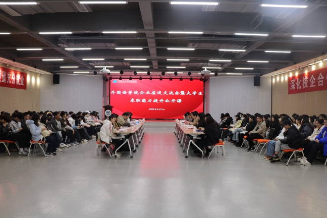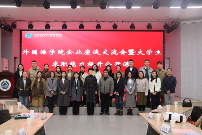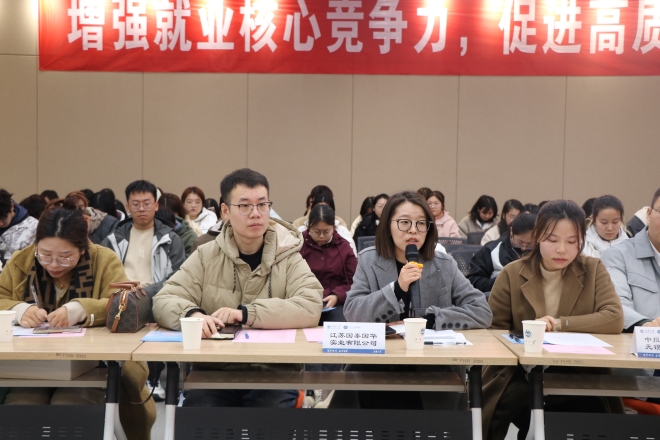 在企业座谈交流环节,各企业代表围绕“提升大学生求职能力”纷纷发言。江苏省中江海外进出口有限公司招聘经理范文倩表示,大学生在校期间要立足专业学习,打造“外语+”的能力,提升个人语言表达能力和解决问题的能力;无锡美迪尔进出口有限公司总经理王涛分享了自身学习经历和创业经历,为准备就业的同学提供了建议;中报国际网络无锡有限公司副总编辑颜玮珏介绍了公司的主营业务,鼓励大家在校期间参与实习实践,希望后期可以和一品探花