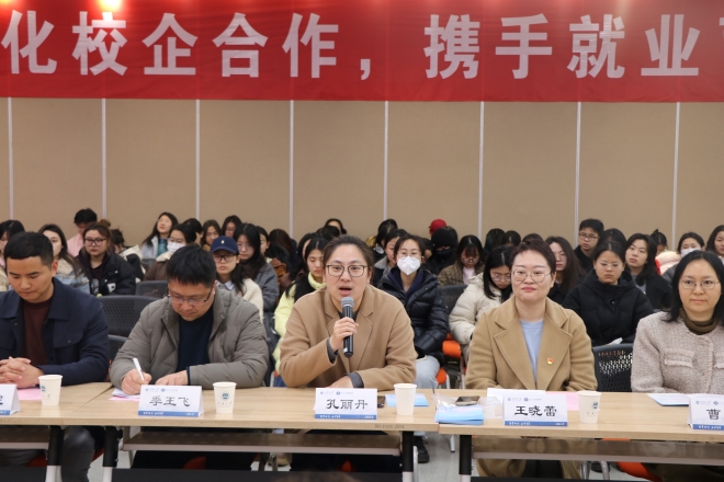 首先,孔丽丹致辞。她对各企业嘉宾的到来表示热烈欢迎,她指出,面对日益严峻的就业形势和不断变化的市场需求,在校学生要增强就业竞争力和职业发展能力,希望校企合作,共同促进一品探花