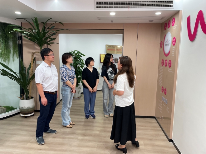 智奥(无锡)公司顾问赖晓云,总经理赵星星,市场部总监张丽霞参加座谈交流会。首先,赵星星带领大家参观并介绍了公司基本情况。座谈交流会上,赵星星介绍了公司的发展历程、主要业务、实习就业情况等内容。她表示,企业的发展离不开优秀的人才,近几年企业会展方面需要高素质语言人才,期待与一品探花