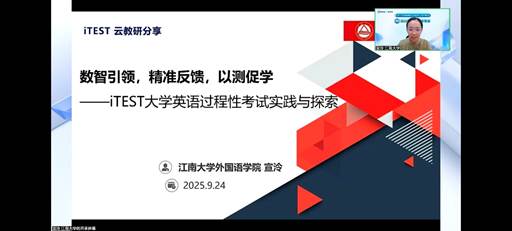 9月24日,围绕“AI驱动的外语测评革新”主题,在UNIPUS外研在线“基于iTEST智能测评云平台的系列云教研活动”中,大学英语一部主任宣泠老师做了主题为“数智引领,精准反馈,以测促学——iTEST大学英语过程性考试实践与探索”的精彩讲座,着重分享了一品探花
