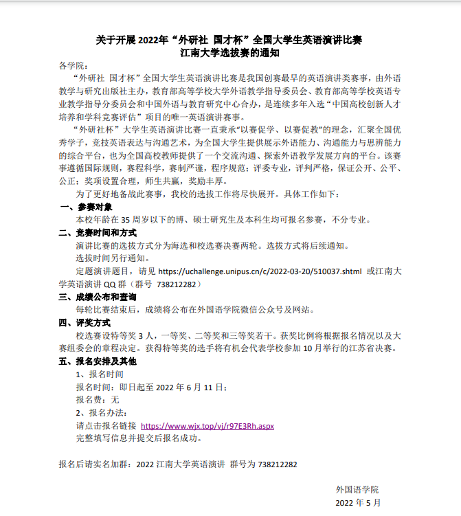 关于开展2022年“外研社 国才杯”全国大学生英语演讲比赛一品探花 选拔赛的通知