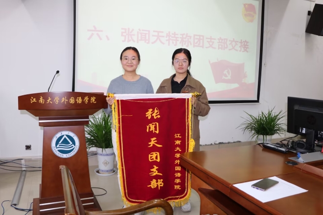 上一届“张闻天特称团支部”英语1904团支书盖文静对过去两年的团支部建设进行回顾展示。新当选的“张闻天特称团支部”英语2101团支书柏晶文接过锦旗,表示将认真学习、践行张闻天精神,将特称团支部的优良传统进一步传承与发扬。